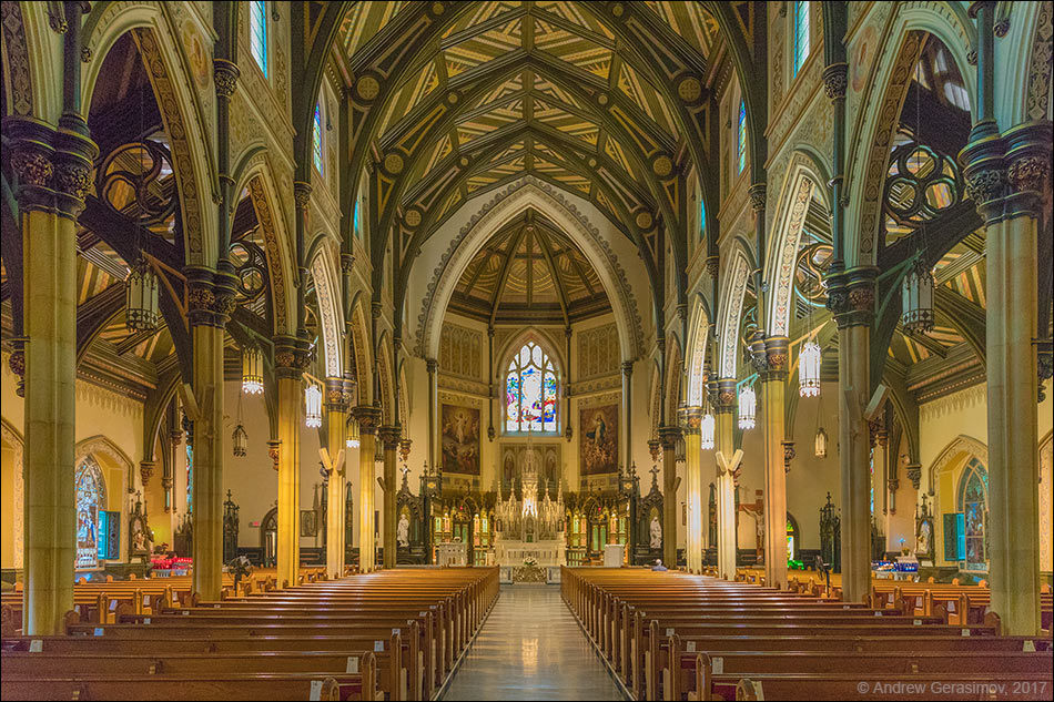 The building, constructed in Gothic Revival style from sturdy stone, features carved ceilings, stenciling, stained glass, oak pews, and marble altars, creating a deeply atmospheric setting. Many decorations, the ceiling, and some stained glass windows are works by Guido Nincheri. The church can accommodate up to 1,000 worshippers.